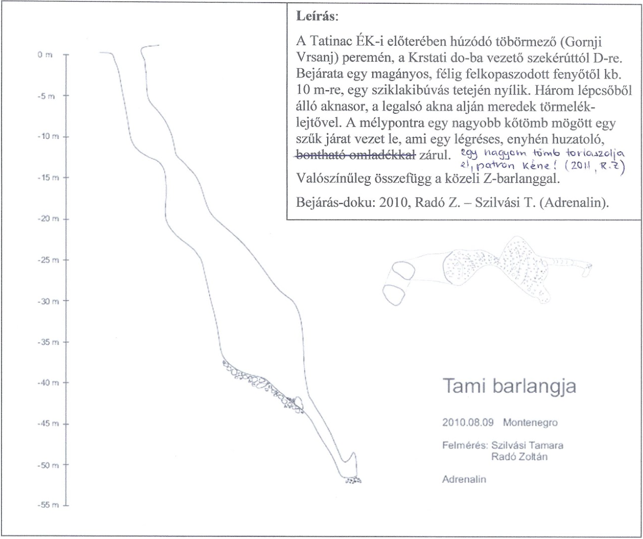 A Tatinac ÉK-i előterében húzódó töbörmező (Gornji Vrsanj) peremén, a Krstati do-ba vezető szekérúttól (Nyúl-lika felé vezető úttól) az elágazás előtt bal oldalon az úttól kb. 70 m-re, D-re. Bejárata egy magányos, félig felkopaszodott fenyőtől kb. 10 m-re, egy sziklakibúvás tetején nyílik. Három lépcsőből álló aknasor, a legalsó akna alján meredek törmelék-lejtővel. A törmeléklejtő aljában egy nagyobb kőtömb mögött további 8 méternyi, szűk lemászást követően érjük el a barlang jelenlegi végpontját. Itt a továbbjutást egy nagyobbacska kő torlaszolja el, mögüle enyhe huzat érezhető. Az omladék és a "főte" között további kb. 1m-t lehet látni. A közelből kis méretű termecske visszhangja hallatszik. A továbbjutást gátló követ megfelelő technikával bontani szükséges, a továbbjutás valószínűleg mindössze fél órás munkával elérhető lehet.
