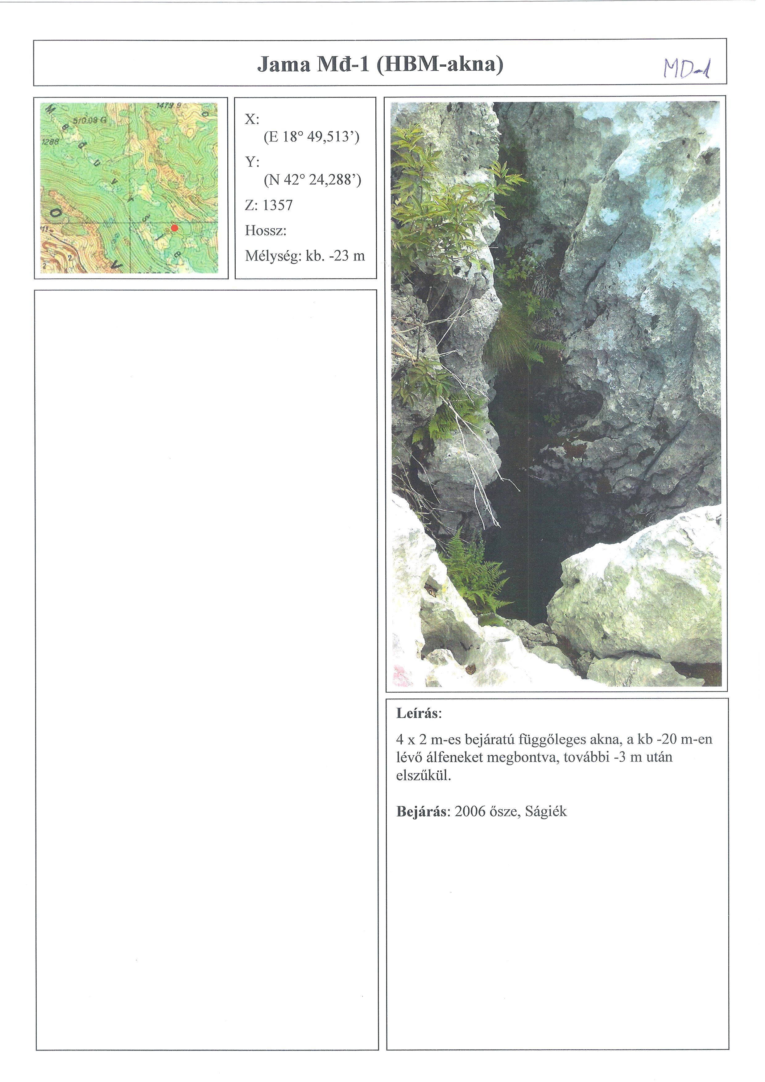 4x2 m-es bejáratú függőleges akna. Kb. -7 és -22 m között egy szűk párhuzamos akna is kíséri. Elszűkülő mélypontját egy kis álfenék megbontásával sikerült elérni.