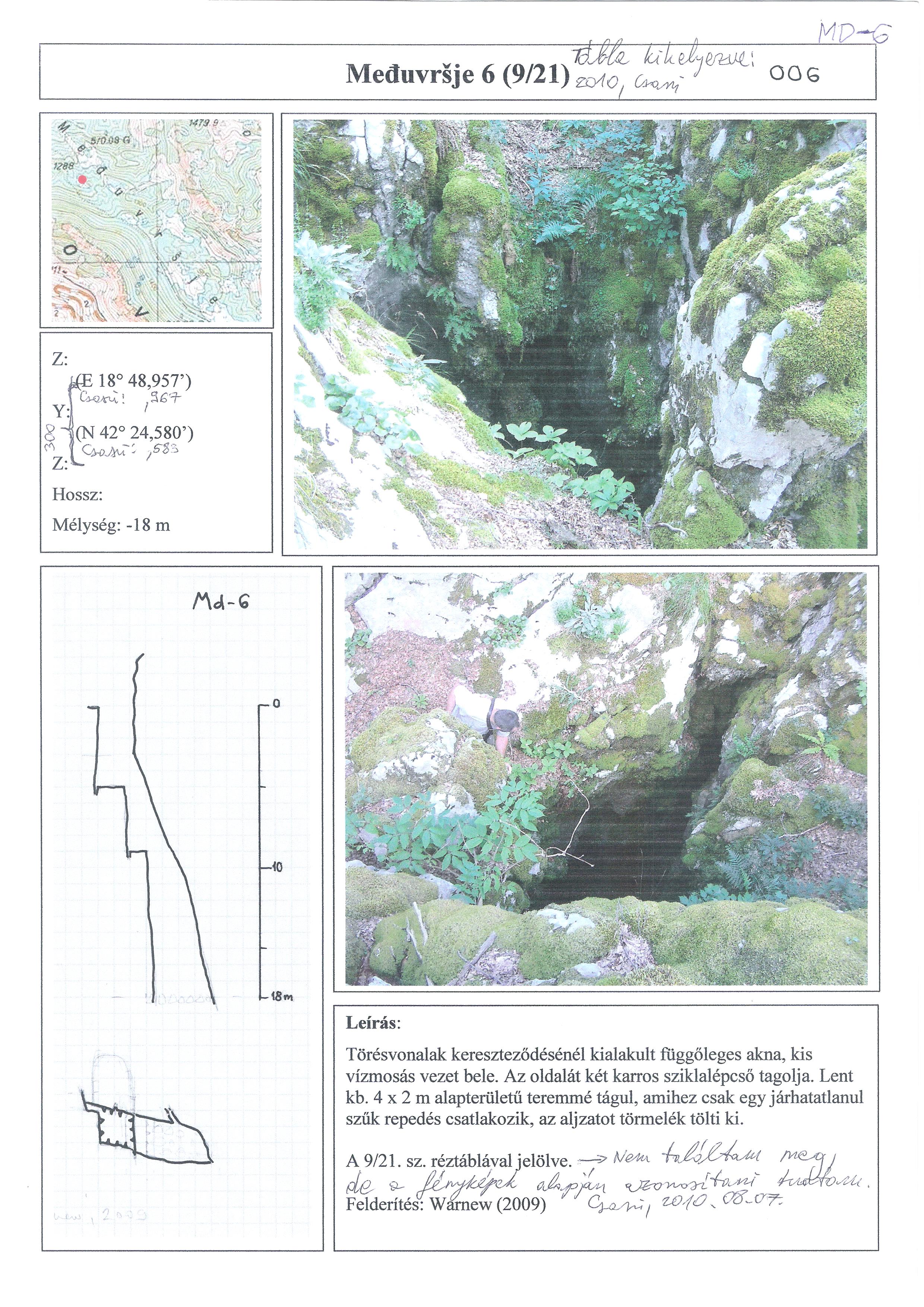 Törésvonalak kereszteződésénél kialakult, függőleges akna. Kis vízmosás vezet bele. Az oldalát karros sziklalépcső tagolja. Lent kb. 4x2 m alapterületű teremmé tágul, amelyhez csak egy járhatatlanul szűk repedés csatlakozik. Az aljzatot törmelék tölti ki.
