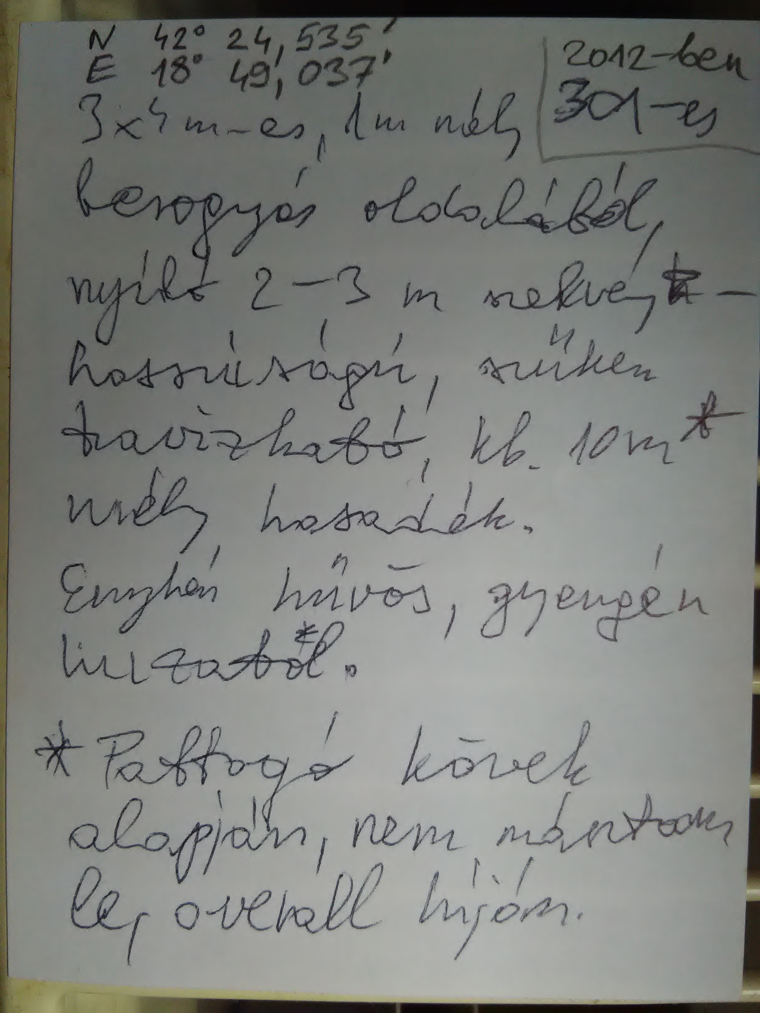 1 m mély, 3x4 m átmérőjű berogyás oldalából nyíló, kb. 10 m mély hasadékakna. Nem teljesen függőleges. A szelvény szűken travizható szélességű, 2-3 m hosszú. Nem jártam be fenékig, mert a megtaláláskor egyedül voltam, overáll nélkül. A mélységet a ledobott kő alapján becsültem meg (pattogott a kis párkányok miatt). A bejárat mögött enyhén hűvös volt a levegő, enyhe huzattal.